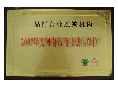 2007年7月16日315和《商品與質量》周刊社聯(lián)合頒給一品鮮食業(yè)連鎖機構“2007年度河南省商業(yè)誠信單位”榮譽證書。