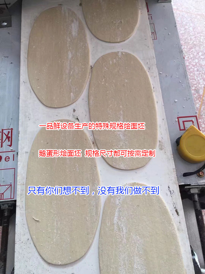 19年的面食機械生產(chǎn)經(jīng)驗,讓一品鮮掌握了更實用的生產(chǎn)技術。客戶需要各種特殊規(guī)格的面坯,我們均可生產(chǎn)出來。以下圖片就是一品鮮設備生產(chǎn)的燒餅坯,荷葉餅,扯面坯(12公分3道。Z蛋型燴面坯和特殊燴面尺寸。