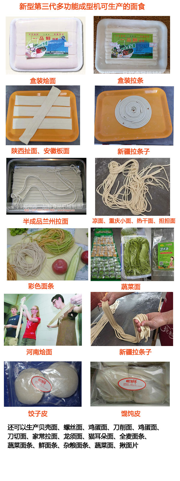 設備所生產產品品種:河南燴面、東北抻面(手撕面)、陜西、山西扯面、安徽扳面、浙江、福建、拉拉面、四川擔擔面、河北拽面、甘肅青海揪面(片)、新疆拉條子、皮帶面、普通鮮面條、掛面、餃子皮、餛飩皮、貝殼面、螺絲面、臊子面、蔬菜面、雜糧面、韭葉面等30余種產品。